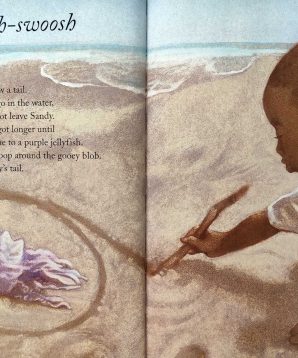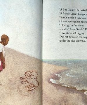 Gregory and his father are spending a day at the beach. When Greg finds a stick and draws a lion in the sand, his father says, “Don’t go in the water, and don’t leave Sandy.” The little boy follows his father’s advice. But he still manages to travel down the beach quite a way before realizing he can no longer see the blue umbrella where Dad is waiting. Greg’s journey takes him past landmarks such as a jellyfish, a sand castle, a big pit in the sand, a ghost-crab hole, and more. Fortunately, he has his stick – and Sandy’s tail – with him the whole way.