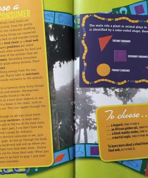 Welcome to an African cloud forest! As you set off down the mountain path, all you see ahead is a thick tangle of vines and bamboo trees. But the cloud forest is full of life, from a collared sunbird hovering over some flowers to a leopard stalking a giant forest hog. Day and night in the cloud forest, the hunt is on to find food and to avoid becoming someone else’s next meal. All living things are connected to one another in a food chain, from animal to animal, animal to plant, plant to insect, and insect to animal.