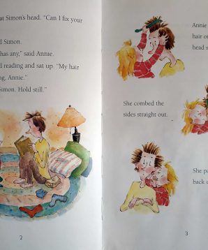 Annie and Simon: little sister and big, big brother. Annie likes to talk – a lot – about what she’s going to be when she grows up, about the clouds and rain and umbrellas, about picnics in the park and meteors, about loons and canoes and turtles. And Simon is a very good listener. He knows a lot about the stars and the weather, how to fix bee stings, and where to look for loons. He knows a lot about being the kind of big brother that keeps a little sister smiling. Whether they are poking around the garden or paddling through a marsh, curious Annie and patient Simon are siblings who are clearly happy in each other’s company.