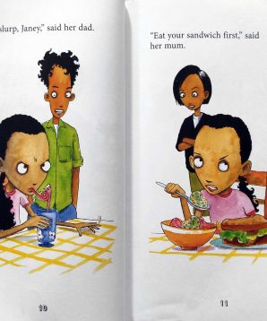 Janey is fed up of being told what to do by her mum and dad. So she jets off to the cafe at the edge of the moon where she can do anything she likes – eating pudding first, splashing in puddles and racing a dinosaur.
