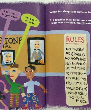 Something quite strange is afoot at Colin’s school. The new substitute principal, Mr. Greystone, has a million rules. He becomes so furious when students draw on his bulletin board that he bans colored art supplies, which has an eerie effect on the once-vibrant school. But Colin’s crayons don’t want to stay put in the trash can, so they plan an escape. Will kaleidoscopic hues return to Hughes Elementary?