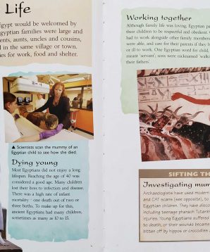 Illustrations and text provide information about life in ancient Egypt, covering the pharoahs, family life, the Nile River, arts and crafts, temples and tombs, and more.