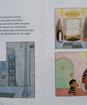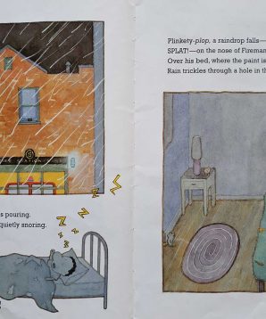 Fireman Small is having trouble sleeping again. Plinkety-plop, a raindrop falls – SPLAT – on the nose of Fireman Small. A leaky ceiling forces him to leave the station and check in at the Pink Hotel. Fireman Small won’t get a restful night’s sleep just yet though… at first it’s the noisy hotel guests preparing for a night on the town that keep him awake, but then it’s the fire down below that gets Fireman Small out of bed and to the rescue!