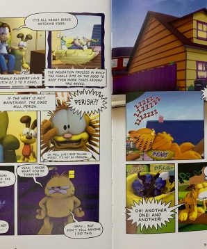 Hunting birds is something Garfield’s never had any interest in. But when he finds a nest full of abandoned eggs, Garfield puts his feline pride aside and decides to help them hatch. Harry, the stray cat from down the block, would love to put the newborn birds right on his dinner menu. As soon as they hatch, the birds assume Garfield is their mother and start following him around everywhere! Garfield can’t take naps any more, and his water bowl has been turned into a bird bath. Is Garfield stuck being the birds’ mom forever? Also featuring the stories “Curse of the Were-dog” and “Little Yellow Riding Hood.”