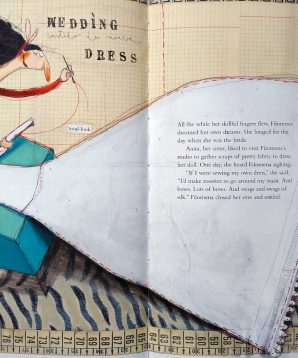 Filomena is a seamstress who spends her days creating gorgeous wedding dresses for many lovely brides. And when it’s finally her turn to be the one to walk down the aisle, she can hardly contain herself. She gets right to work, putting her heart and soul into making her dress. But Filomena gets carried away. She adds so many frills, feathers, and lace that her groom barely recognizes the girl he loves!