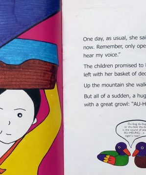 The tiger, a popular character in Korean art and folktales, is a villain in this origin tale. Having gobbled up the rice cake seller and all her rice cakes, the tiger chases her two small children. But they escape. And the tiger? What happens to the tiger is… AI-KOO!