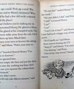 In these four stories the Queen is coming to visit Horrid Henry’s school, he tries to hypnotise Moody Margaret, he tricks Perfect Peter into doing his household chores and Horrid Henry has a bath.