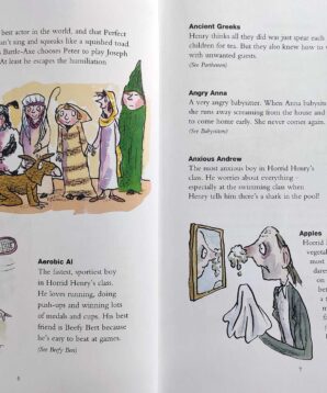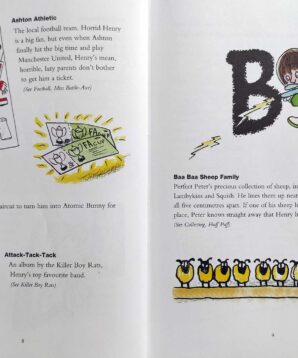 A is for APRIL FOOLS’ DAY, Horrid Henry’s favourite day of the year (except his birthday, of course.) B is for BOGEY BABYSITTER, Rabid Rebecca, the toughest teen in town. C is for CHRISTMAS PRESENTS, Father Christmas had better get it right this year! From the Purple Hand to pink frilly knickers; supersoakers to Sour Susan; football fiends to fizzywhiz drinks; demon dinner ladies to Dungeon Drinks – this book has it all and more. An encyclopedia of absolutely EVERYTHING you ever wanted to know about Horrid Henry.