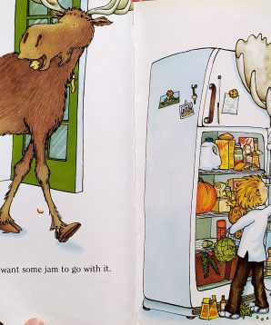 If a big hungry moose comes to visit, you might give him a muffin to make him feel at home. If you give him a muffin, he’ll want some jam to go with it. When he’s eaten all your muffins, he’ll want to go to the store to get some more muffin mix. In this hilarious story, a boy is run ragged by a surprise guest. Young readers will delight in the comic complications that follow when a little boy entertains a gregarious moose.