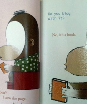 A mouse, a jackass and a monkey discover a new thing. Flat and rectangular, with a hard cover and a soft, yielding inside, it baffles the jackass, while the be-hatted monkey tries patiently to explain its curious technology.