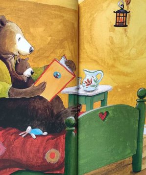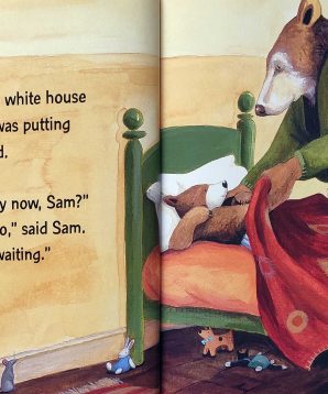 It was a dark and stormy night on Plum Street. In the little white house, Mrs. Bear was putting Sam to bed. Outside, the wind blows and the rain comes down. Inside, it is Sam’s bedtime. Mrs. Bear reads him a story, tucks him in, and brings him warm milk. “Are you ready now, Sam?” she asks. “I’m waiting,” he says. What else does Sam need before he’ll go to sleep? Could Mrs. Bear have forgotten a kiss?