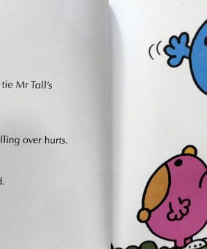 Little Miss Helpful tries to help everyone but ends up making everything worse. She tries to tie Mr. Tall’s shoelaces, but she ends up tying both shoes together. Then she tries to help Mr. Happy when he is sick, and getting the cleaning supplies, but her head was stuck in the bucket, and got trapped in the refrigerator!