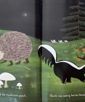 It’s evening in the forest and Little Owl wakes up from his day-long sleep to watch his friends enjoying the night. Hedgehog sniffs for mushrooms, Skunk nibbles at berries, Frog croaks, and Cricket sings. A full moon rises and Little Owl can’t understand why anyone would want to miss it. Could the daytime be nearly as wonderful? Mama Owl begins to describe it to him, but as the sun comes up, Little Owl falls fast asleep.