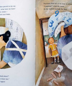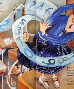 Each time her teacher asks, “What’s seven times ten?” a young girl experiences a severe case of arithmetic strain. “Numbers flew out of my head by the score. They stuck to the ceiling; they bounced off the floor!” Soon, exploding numbers are taking over her classroom, her school – then the entire town! Ebullient verse and ingenious collage illustrations full of hilarious escalating antics make this kid-centric romp through the dreaded times tables a read-aloud gem.