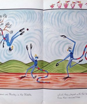 The monkeys that live at the foot of the Mbuno Hills in Africa love to play games. One day while playing Elephant in the Middle with their large friend, their ball, a nut from an ancient baobab tree, rolls into a cave where the troop of monkeys never go. It is dark inside and possibly filled with horrible beasts! When they venture in, they discover instead that the walls are covered with paintings of animals. Elephant shows the monkeys how they too can create artwork using their hands and feet as “stamps” and mud as their medium. But things are never quite as easy as they seem.