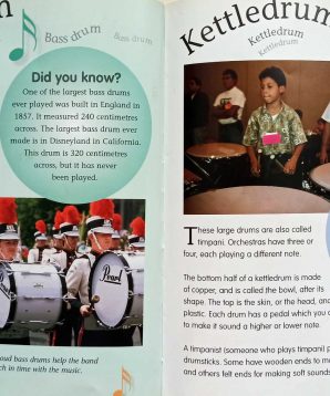 Describes different kinds of percussion instruments and how they are used, including the bass drum, cymbals, xylophone, and triangle.