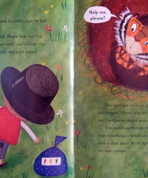 As a merchant makes his way to the market, he comes across a beautiful tiger that has fallen down a hole. The merchant is kind enough to help the tiger out of the hole, but once he does, the tiger wants to eat him! The merchant doesn’t think this is fair… but who is right and how can the merchant get away unscathed?