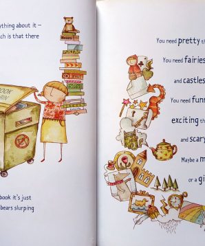 Ella wants to tell you a story – a story with absolutely no bears. You don’t need bears for a book. You need pretty things like fairies and princesses and castles and maybe funny things and exciting things. In Ella’s kind of story, there are no bears in the village or the castle or the deep dark forest or faraway lands. But there might be… a monster!