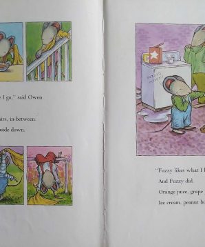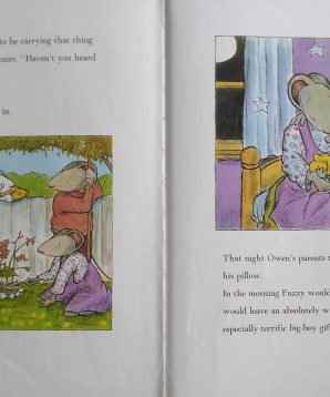 Owen had a fuzzy yellow blanket. “Fuzzy goes where I go,” said Owen. But Mrs. Tweezers disagreed. She thought Owen was too old for a blanket. Owen disagreed. No matter what Mrs. Tweezers came up with, Blanket Fairies or vinegar, Owen had the answer. But when school started, Owen’t mother knew just what to do, and everyone – Owen, Fuzzy, and even Mrs. Tweezers – was happy.