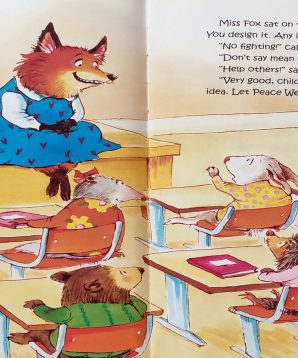 Miss Fox is tired of hearing her young students quarrel. So she announces Peace Week – no more squabbling for one whole week! The children chime in with their own rules: no fighting, don’t say mean things, and help others. Throughout the week each of the little animals gets a chance to practice this new behavior. When Polecat teases Bunny for wearing a bright yellow sweater, instead of poking fun back at Polecat, Bunny admires his sweater.