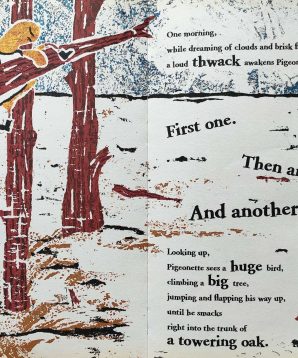 In his oversized undershirt, mighty yellow Pigeon towers over the minute, blue Pigeonette. With their black boots and outstretched wings, the loving duo enlivens each speckled spread. Playing with perspective and size, curved lines support the warm interactions, this quirky tale will beguile.