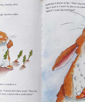 Rainbow loves carrots. Lovely, crunchy, juicy carrots. She eats one every morning for breakfast. So she is very worried when her front tooth falls out. Rainbow, Heather Hedgehog, Ted Mole, Mr Robin and Philip Field Mouse head off to the forest. Will they find the dentist with a bushy red tail? Will he be able to fix Rainbow’s tooth?
