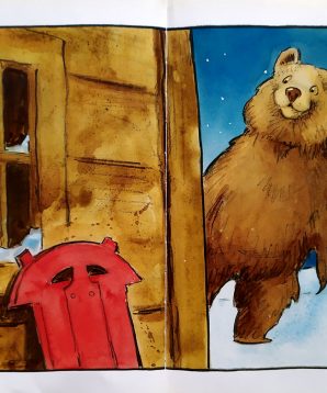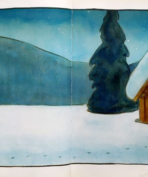 In this almost wordless picture book, a host of woodland creatures take a child’s sled for a night time joy ride. Their whimsical ride is gorgeously depicted in bold watercolor, complemented by humorous expressions and pitch-perfect sound effects.