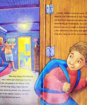 Today is the day! Finally Roberto will take his trip on the teleferico to the top of El Avila, the mountain overlooking his village. Since Papa has to work, Tio Antonio will go with his nephew, who makes sure to pack his camera so he can share the sights later with Papa. Up, up, the cable car goes, over gasp-inducing ravines, to an exciting new world of vendors, animals, and a spectacular view of Caracas below.