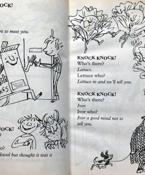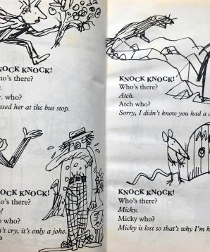 This book contains more than 100 classic knock-knock jokes with humorous line illustrations. “Knock Knock. Who’s there? Aardvark. Aardvark who? Aardvark a hundred miles just for one of your smiles!”