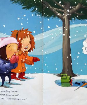 B-R-R-R-R! AH-CHOO! Sneezy the Snowman is cold, cold, cold. To warm up, he drinks cocoa, sits in a hot tub, stands near a warm fire – and melts! But the children know just what to do to build him up again and make him feel “just right.”