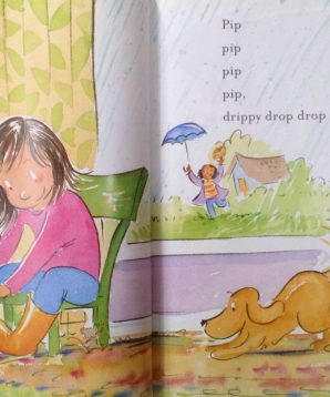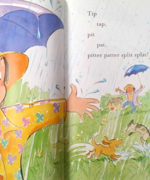 I sing a little rain song, a simple song, a plain song, a pitter-patter-tip-tap-on-the-windowpane song. Drip drop, plip plop, pit pat, split splat! Put down your umbrella! Take off your galoshes! It’s time to sing and dance in the rain. When one little girl and her adorable dog venture out on a rainy, spring day, the neighborhood joins her and what results is squishy, sloshy, muddy day fun.