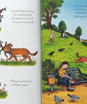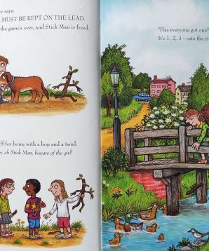Stick Man lives in the family tree with his Stick Lady Love and their stick children three. But it’s dangerous being a Stick Man. A dog wants to play with him, a swan builds her nest with him. Heeven ends up on a fire! Will he ever get back to the family tree?