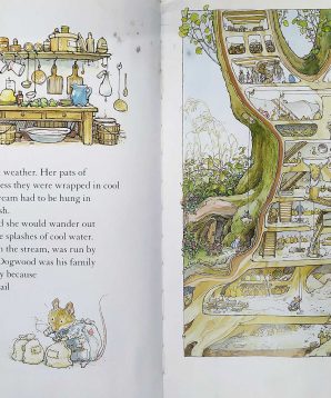 It was such a hot summer. The sky was deep blue and the sun never faltered. All along Brambly Hedge, the mice did their best to keep cool. Poppy Eyebright sought refuge in the mossy shadows of the mill wheel; Dusty Dogwood took to walking by the banks of the cooling stream. Dusty and Poppy spent more and more time together, so no one was at all surprised when they announced their engagement. They decided on a very unusual setting for the wedding ceremony, but even they didn’t realize just how unusual it would prove to be!