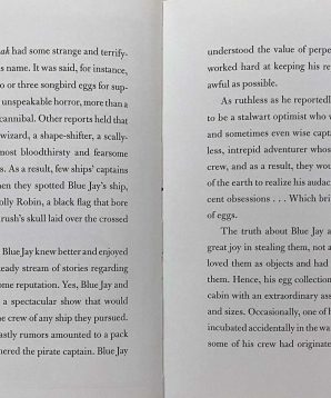 Captain Blue Jay, notorious and feared pirate of the skies, has a fondness for collecting treasure, especially eggs. Unfortunately, sometimes his treasure hatches, and this time the hatchling is the strangest one the Grosbeak has ever seen. No sailor is certain whether the chick is a young god or just an oversized bird who needs too much food, but one thing is clear: the winds over Thrushland are shifting, and dramatic changes are in store for all.