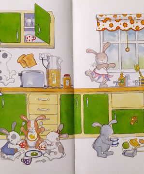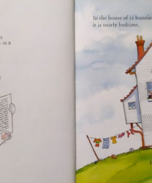 In the house of 12 bunnies it is nearly bedtime, but Sophia has lost something. Throughout the day she searched through the kitchen cupboards with 5 cups, 4 plates, and 2 bowls; in the bathroom with 4 spotted towels, 5 striped ones, and 1 with a hole in it; even in the bedroom with 4 bunk beds, 3 cots, and 1 trundle bed. Finally Sophia finds her treasure; a cozy bedtime story to put the snuggly bunnies to sleep.
