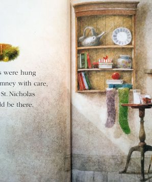 Visually she extends this favorite Christmas story for children, who will delight in watching the two mischievous stowaways from the North Pole enthusiastically exploring the sacks of gifts on the roof while St. Nick, unaware, journeys down the chimney… until the toys spill down onto the lawn and he turns with a jerk!