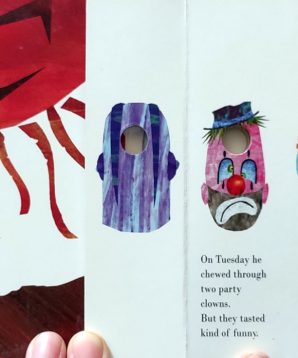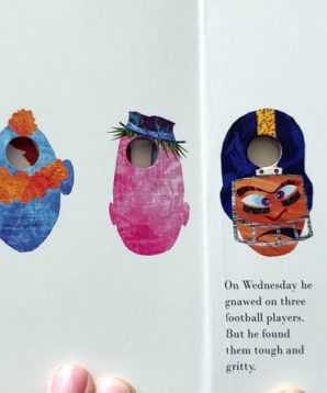 In this dead-on parody of a children’s classic, a very hungry zombie eats his way through a variety of his favorite foods, including clowns, astronauts, rock stars, and brains. With vivid, playful art and amusing text, this book will appeal to picture-book lovers of all ages. Adults will catch its slightly demented humor. Older kids who grew up on classic board books will love the fun of the parody. And because the art leans toward humor rather than truly graphic grossness, a new generation of little ones may just grow up loving a creepy zombie whose gluttony earns him a bellyache.