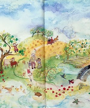 As the sun rises, the weaver begins her work, spinning thread, dying it, and then weaving it into a cloth along with the signs of love and friendship she sees down on earth. At the end of the day, the weaver spreads this extraordinary cloth over us, to warm and protect us all through the night.