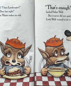 Little Wolf is tired of his mom’s cooking! It’s the same old thing night after night, Lamburgers and Sloppy Does. How he wishes his mother would serve up a nice platter of his favorite dish – Boy! But Boy is hard to come by these days. As Little Wolf trudges home from school one day, he decides to postpone his boring dinner by shouting “Boy! Boy!” But what will happen when a real boy finally comes along? In this hilarious twisted tale, Little Wolf learns the same timeless lesson that the boy who cried “Wolf!” did so many years ago.