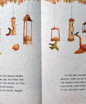 Old Man Fookwire is a grump who only likes to paint pictures of birds that visit his backyard. The problem is, they fly south every winter, leaving him sad and lonely. So he decides to get them to stay by putting up beautiful bird feeders filled with seeds and berries. Unfortunately, the squirrels like the treats, too, and make a daring raid on the feeders. The conflict escalates – until the birds depart (as usual), and the squirrels come up with a plan that charms the old grump.