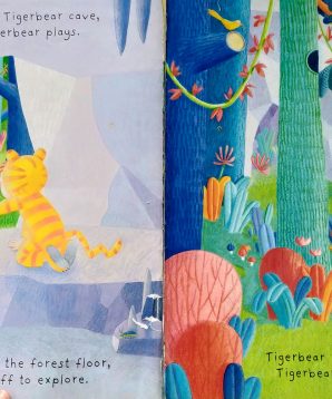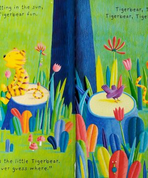 Join Tigerbear as he hops from rock to rock, swishes through tall grass and splishes through mud! Come and play hide and seek with Tigerbear and his new friend in a dark, dark cave. Is there really a scary monster? It’s up to Tigerbear to save the day!