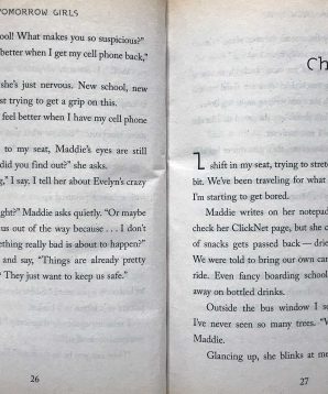 Country Manor School isn’t all excitement, though. Louisa isn’t sure how she feels about her new roommates: athletic but snobby Rosie and everything’s-a-conspiracy Evelyn. Even Maddie seems different away from home, quiet and worried all the time. Still, Louisa loves CMS – the survival skills classes, the fresh air. She doesn’t even miss not having a TV, or the internet, or any contact with home. It’s for their own safety, after all. Or is it?