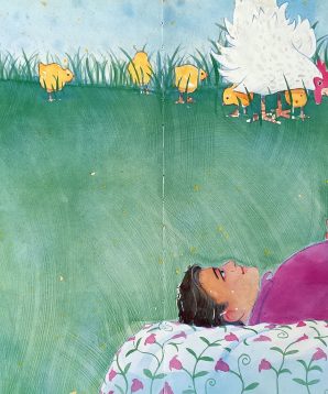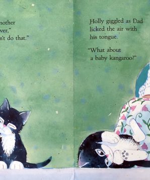 Holly’s dad decides to tell her a bedtime story about the night she was born so Holly asks if she hatched out of an egg like a chicken. Dad tells her if she were a new chick, her mum would have fluffed up her feathers and sat on her to keep her warm. Your mother didn’t do that. They go through all the animals they can think of until Holly’s dad finally tells her what her mother did do when she was born!